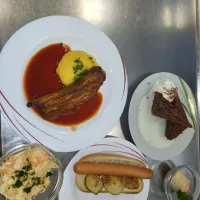 Der ganze Tag stand kulinarisch bereits unter dem Motto "Amerika". Unser Küchenleiter Herr Müller hatte sich ein schönes Menü überlegt. So gab es bereits zum Frühstück Rührei mit Bacon. Zum Mittagessen gab es Spare-Ribs mit Barbecussauce, Cole Slaw und Pumpkin-Mashed-Potatoes und zum Dessert Brownies mit Vanillesauce.