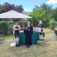 Der letzte Tag unserer Festwoche begann mit einem Festgottesdienst im Garten unter der Leitung der Pfarrerin Frau Claudia Falkenreck-Wünsche und unter Beteiligung unserer Einrichtungsleitung Frau Kreth und der stellvertretenden Leiterin des Begleitenden und Sozialen Dienstes Frau Henze. In dem stimmungsvollen Gottesdienst packten die drei Damen zusammen eine Erinnerungskiste, die allerlei bedeutungsvolle Dinge, die viele unterschiedliche Erinnerungen an vergangene Begebenheiten wecken, enthielt, wie zum Beispiel ein Fotoalbum, Gartenhandschuhe, eine Brille, das Strickzeug der Oma, Schuhputzzeug, eine Urkunde und einen Kochlöffel.