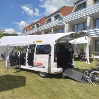 Auf unserer Rasenfläche hatte sich ein Wagen des Grupe Fahrservices für Kranken- und Rollstuhlbeförderung platziert und erklärte allen Interessierten den Transport eines Rollstuhlfahrers. Wer mochte, konnte das Ganze mit einem vom Sanitätshaus Sturm leihweise zur Verfügung gestellten Rollstuhls auch direkt ausprobieren. Auch Herr Homann probierte das "Rolli-Car" selbst einmal aus.
