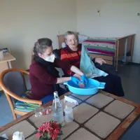Zur gleichen Zeit wurden auf den Wohnbereichen altbekannte Volkslieder gesungen. Die Bewohnerinnen und Bewohner ließen sich hier mitreißen, so dass die Mitarbeiterinnen des BuSD sehr aufpassen mussten, dass die Farbe beim Nägel lackieren nicht doch woanders landete. Es war ein sehr entspannter und fröhlicher Vormittag.