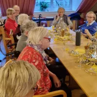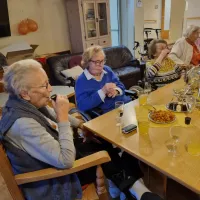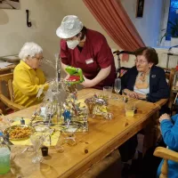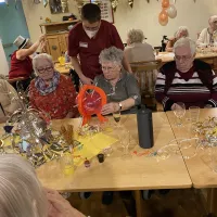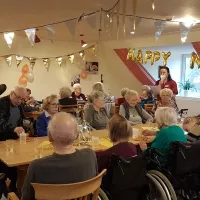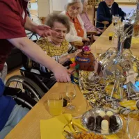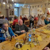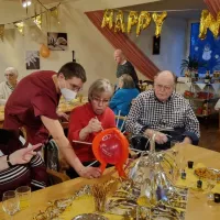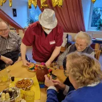 Bereits am Nachmittag starteten die Feierlichkeiten in der Wilhelm-Busch-Stube, die entsprechend bunt dekoriert war. Bei fröhlicher Musik, lustigen Gesellschaftsspielen, Rätseln, Gedichten und Reimen und einer Bewegungsgeschichte, bei der alle im Rahmen ihrer Möglichkeiten mitmachen mussten, gab es Knabbereien und Süßes, Eierlikör und natürlich auch Sekt.
