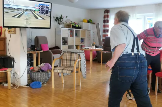 Dank der Spielekonsole kam die Kegelbahn einfach ins Haus und die Kollegen aus der Küche haben für das Essen gesorgt. So konnten die Bewohner einen aktiven Nachmittag mit viel Spaß verbringen und sich im Anschluss mit Gyros und Pommes stärken.