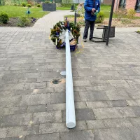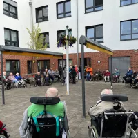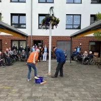 Heute wurde das diesjährige Maibaumsetzen begangen. Liebevoll hergerichtet wurde in den vergangenen Wochen der Baum, Kranz und Schmuck durch die Haustechniker und Betreuungskräfte. Mit vereinten Kräften gelang das Aufstellen und Ausrichten des Mastes unter dem Applaus der zahlreich teilnehmenden Bewohner:innen. Bei einem Eierlikör ließ sich trotz der frischen Temperaturen trefflich über die Sitten und Bräuche des Maibaumsetzens schwadronieren.