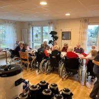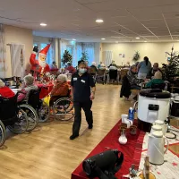 Eigentlich sollte die diesjährige Nikolausfeier unter Coronabedingungen ja wieder draußen als Weihnachtsmarkt stattfinden. Leider konnten die Marktbuden wetterbedingt nicht aufgestellt werden, ein Sturmtief machte uns einen Strich durch die Rechnung. Also wurde ganz traditionell unser Saal "Op de Deel" weihnachtlich hergerichtet und das Programm wurde nach innen verlegt. Neben kulinarischen Leckereien wie Kaffee, Lebkuchen und Spekulatius, Glühwein und frischer Bratwurst vom Grill gab es auch einen kleinen Basar, wo selbst gebastelte Weihnachtsdekoration von den Bewohnerinnen und Bewohnern sowie des Betreuungspersonals gekauft werden konnte. Abschließend wurden von Einrichtungsleiter Joachim Pusch Adventsgedichte vorgetragen.
