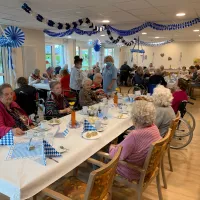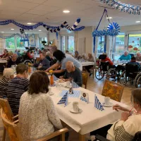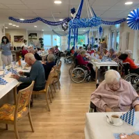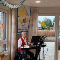 Ganz traditionell blau-weiß geschmückt war der Saal "Op de Deel" für das diesjährige bayerische Oktoberfest. Große Teile der Bewohnerschaft fieberten schon seit Tagen diesem Ereignis entgegen. Bei landestypischen Leckereien wie Apfelstrudel mit Vanillesauce, Salzbrezeln und frischem Weißbier wurde zünftig gefeiert und man ließ es sich gut gehen. Der überwiegende Teil der Gestaltung und der Service wurde vom fleißigen Betreuerteam um Dunja Prehn, Sabine Pommer, Petra Lehmann und Wolfgang Roßmann übernommen, für das leibliche Wohl sorgte Küchenchef Klaas Engberding und Küchenfee Anette Sedler. Die launige musikalische Unterhaltung oblag dem schönen Erwin, dem lustigen Musikanten aus Lunestedt (Erwin Müller). Das gelungene Fest hinterließ ausschließlich glückselige und zufriedene Bewohnerinnen und Bewohner, mit geröteten Wangen ging man am Abend müde zu Bett.