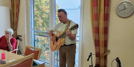 Viele Panoramafenster in allen Stockwerken sorgen für angenehmes Tageslicht, das auch in das elegante Restaurant im Erdgeschoss und das angrenzende Kaminzimmer mit seiner umfangreichen Bibliothek reicht. Unsere Räumlichkeiten bieten die besten Bedingungen, um gemeinsam Feste und Gottesdienste zu feiern, zu musizieren oder Konzerten zu lauschen. Immer gern gesehene Gäste sind dabei Angehörige. Sie sind zudem wichtige Ansprechpartnerinnen und -partner, für die wir regelmäßig Angehörigenabende veranstalten.
