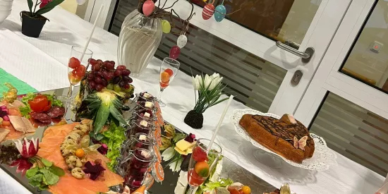 In unserer hauseigenen Küche werden die täglichen Mahlzeiten frisch zubereitet: Vom Frühstück über Zwischenmahlzeit, Mittagessen und Kaffeezeit bis hin zum Abendessen und dem auf Wunsch servierten spät abendlichen Snack. Auch Diät- oder Schonkost bieten wir Ihnen selbstverständlich gerne an – so kann es sich jede und jeder bei uns schmecken lassen. Das abwechslungsreiche Verpflegungskonzept ist angepasst an die aktuellen Empfehlungen der Deutschen Gesellschaft für Ernährung e.V. (DGE). Auch regionale Spezialitäten sowie die Wünsche der Bewohnerinnen und Bewohner werden dabei natürlich berücksichtigt. Getränke wie Kaffee, Kakao, Tee, Wasser und verschiedene Fruchtgetränke stehen stets zur Verfügung. Private Feiern der Bewohnerinnen und Bewohner sind ebenfalls möglich – wir helfen gerne bei der Vorbereitung.