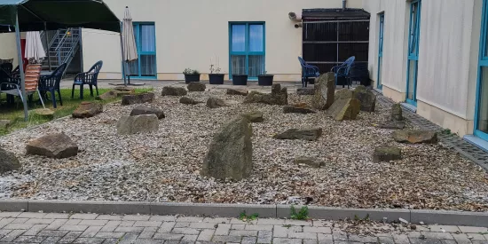 Mitten in einer beschaulichen Wohngegend, gegenüber der örtlichen Kirche, liegt die DOREAFAMILIE Lauenau in ruhiger Lage. Auf dem 5.000 Quadratmeter großen Gelände mit Blick auf den Deister laden ein idyllischer Garten mit einem Goldfisch-Teich sowie eine große Sonnenterrasse zum entspannten Verweilen ein.