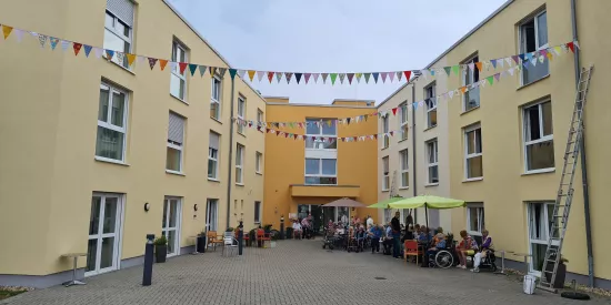 Geselliger Mittelpunkt jeder Wohngruppe ist eine Wohnküche, an die im Erdgeschoss eine Terrasse und jeweils große Balkone in den oberen Etagen angrenzen. Hier lohnt es sich, gemeinsam frische Luft zu schnappen und die Sonne zu genießen. Ein beliebter Treffpunkt unserer Bewohnerinnen und Bewohner ist auch unser schöner Innenhof. Ein barrierefrei gestalteter Weg rund um unsere Einrichtung ermöglicht darüber hinaus auch Seniorinnen und Senioren mit Mobilitätseinschränkungen einen Ausflug mit Rollstuhl oder Rollator – eine Möglichkeit, die oft und gerne genutzt wird.