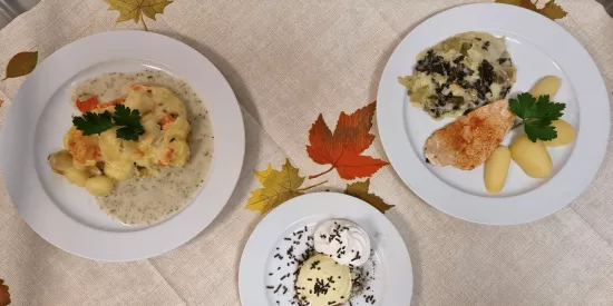In unserer hauseigenen Küche werden die täglichen Mahlzeiten frisch zubereitet: Vom Frühstück über Zwischenmahlzeit, Mittagessen und Kaffeezeit bis hin zum Abendessen und dem auf Wunsch servierten spät abendlichen Snack. Auch Diät- oder Schonkost bieten wir Ihnen selbstverständlich gerne an – so kann es sich jede und jeder bei uns schmecken lassen. Das abwechslungsreiche Verpflegungskonzept ist angepasst an die aktuellen Empfehlungen der Deutschen Gesellschaft für Ernährung e.V. (DGE). Auch regionale Spezialitäten sowie die Wünsche der Bewohnerinnen und Bewohner werden dabei natürlich berücksichtigt. Getränke wie Kaffee, Kakao, Tee, Wasser und verschiedene Fruchtgetränke stehen stets zur Verfügung. Private Feiern der Bewohnerinnen und Bewohner sind ebenfalls möglich – wir helfen gerne bei der Vorbereitung.