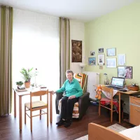 Hier leben die Bewohnerinnen und Bewohner in sieben überschaubaren Wohngruppen, die sich auf drei Wohnbereiche verteilen. Die Zimmer ordnen sich jeweils um einen gemeinsamen Aufenthaltsbereich herum an. Mittelpunkt jeder Wohngruppe ist eine große, gemütliche Wohnküche, mit angeschlossenem Gemeinschaftsbalkon, der einlädt, frische Luft zu schnappen und Sonne zu tanken. Als beliebten Treffpunkt nutzen unsere Bewohnerinnen und Bewohner den Innenhof mit seinem Gartenbereich. Dort kann man spazieren gehen, gemütlich sitzen oder unseren kleinen Zoo mit Hühnern und Enten besuchen. Die Gemeinschaftsterrasse verfügt über zahlreiche beschattete Sitzplätze.