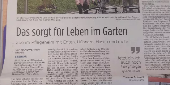 Hier leben die Bewohnerinnen und Bewohner in sieben überschaubaren Wohngruppen, die sich auf drei Wohnbereiche verteilen. Die Zimmer ordnen sich jeweils um einen gemeinsamen Aufenthaltsbereich herum an. Mittelpunkt jeder Wohngruppe ist eine große, gemütliche Wohnküche, mit angeschlossenem Gemeinschaftsbalkon, der einlädt, frische Luft zu schnappen und Sonne zu tanken. Als beliebten Treffpunkt nutzen unsere Bewohnerinnen und Bewohner den Innenhof mit seinem Gartenbereich. Dort kann man spazieren gehen, gemütlich sitzen oder unseren kleinen Zoo mit Hühnern und Enten besuchen. Die Gemeinschaftsterrasse verfügt über zahlreiche beschattete Sitzplätze.