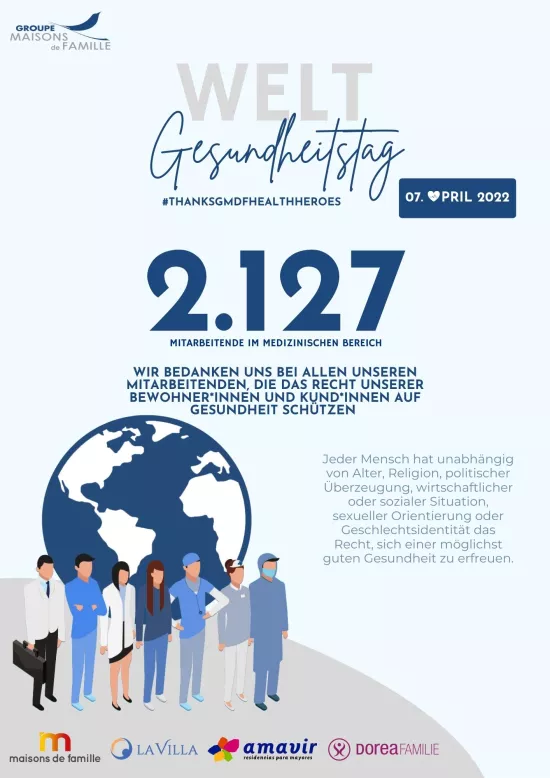 Als Teil der Groupe Maisons de Famille dankt die DOREAFAMILIE gemeinsam mit den Kolleginnen und Kollegen aus Frankreich, Spanien und Italien allen Mitarbeitenden, die die Gesundheit der Bewohner*innen und Kund*innen täglich schützen, erhalten und fördern.